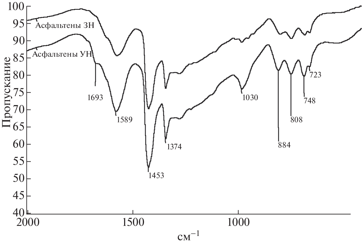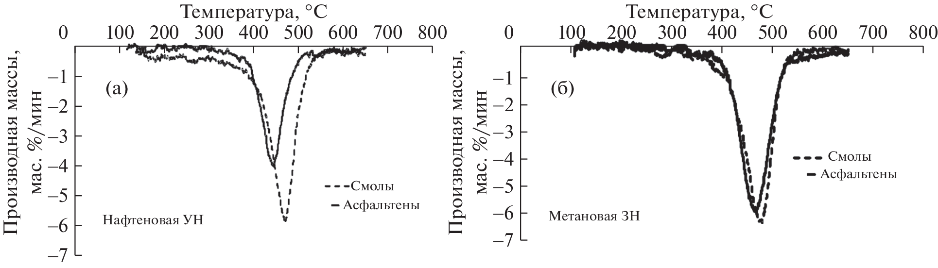 The thermal stability of resins and asphaltenes of naphthenic and methane heavy oils was studied by thermogravimetry. Based on the data of physicochemical methods of analysis, it was shown that the resins and asphaltenes of the test oils had significant differences in molecular weight, elemental composition, and distribution of carbon atoms in structural fragments. Thermogravimetric analysis was performed by heating the samples from 25 to 650°С at a rate of 10 K/min in an atmosphere of argon. It was shown that the maximum rate of weight loss of naphthenic oil resins and asphaltenes occurred at lower temperatures, as compared to similar components of methane oil. The thermal stability of resins and asphaltenes depended on the composition and structural organization of these components due to their formation from oil dispersed systems of various chemical types. It was established that the thermal stability of resins and asphaltenes of methane oil was higher than the thermal stability of similar components of naphthenic oil.