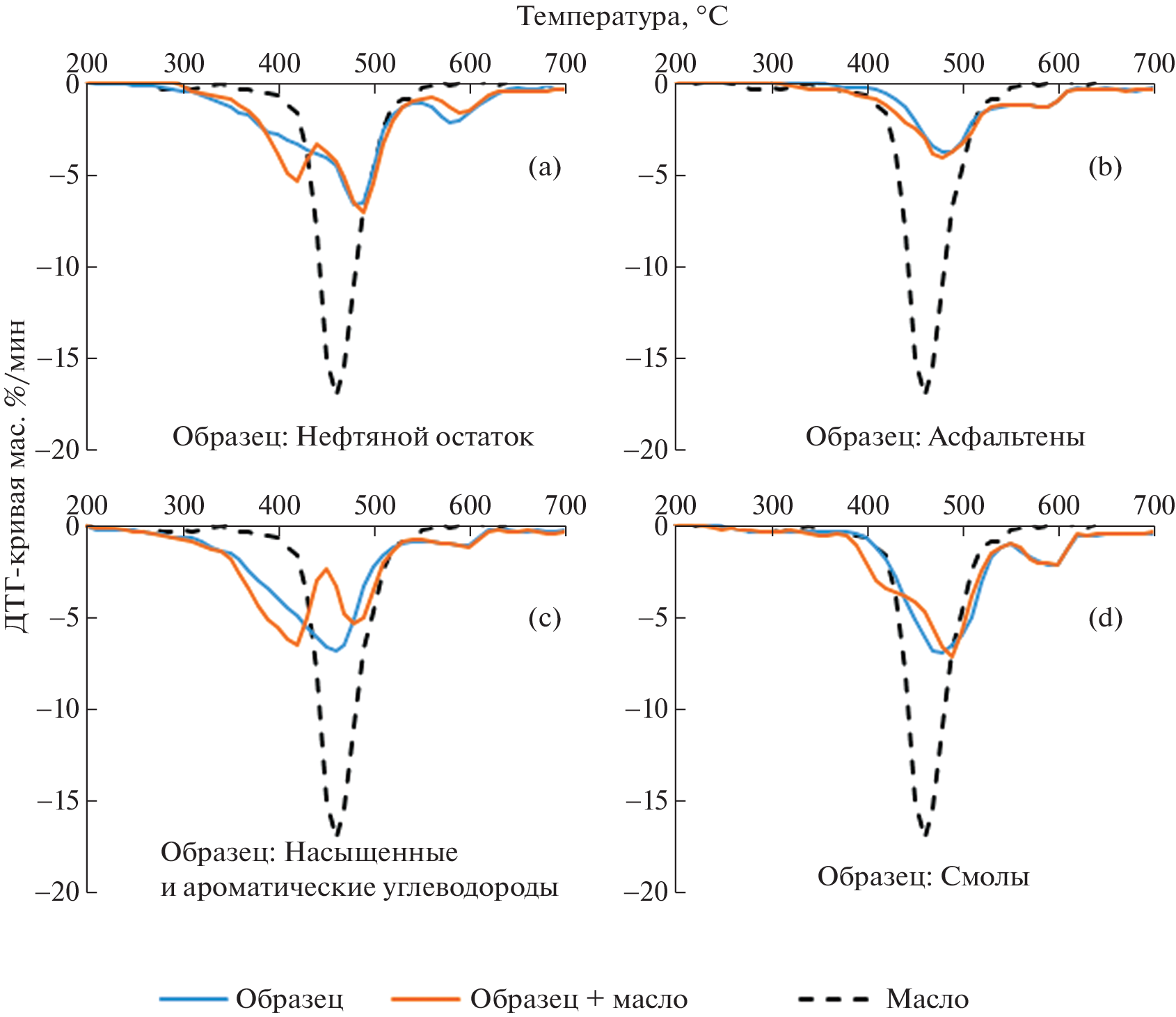 Dynamic thermogravimetry was used to study the thermal degradation of the oil residue of Usinskaya oil and its saturated, aromatic, resin, and asphaltene (SARA) fractions in the presence of sunflower oil. Thermolysis experiments were carried out in an atmosphere of pure argon. Based on the data of thermogravimetric analysis, the activation energies of the thermal degradation of the oil residue, resins, asphaltenes, saturated and aromatic hydrocarbons, and their mixtures with sunflower oil were calculated in the temperature range of a maximum weight loss rate. It was shown that the addition of 10.0 wt % sunflower oil to the oil residue and its components led to a decrease in the activation energy. This fact indicates that the sunflower oil additive affected the mechanism of thermal degradation of crude oil and its components. The greatest change in the activation energy was observed for asphaltenes: ΔЕа = 48.4 kJ/mol.