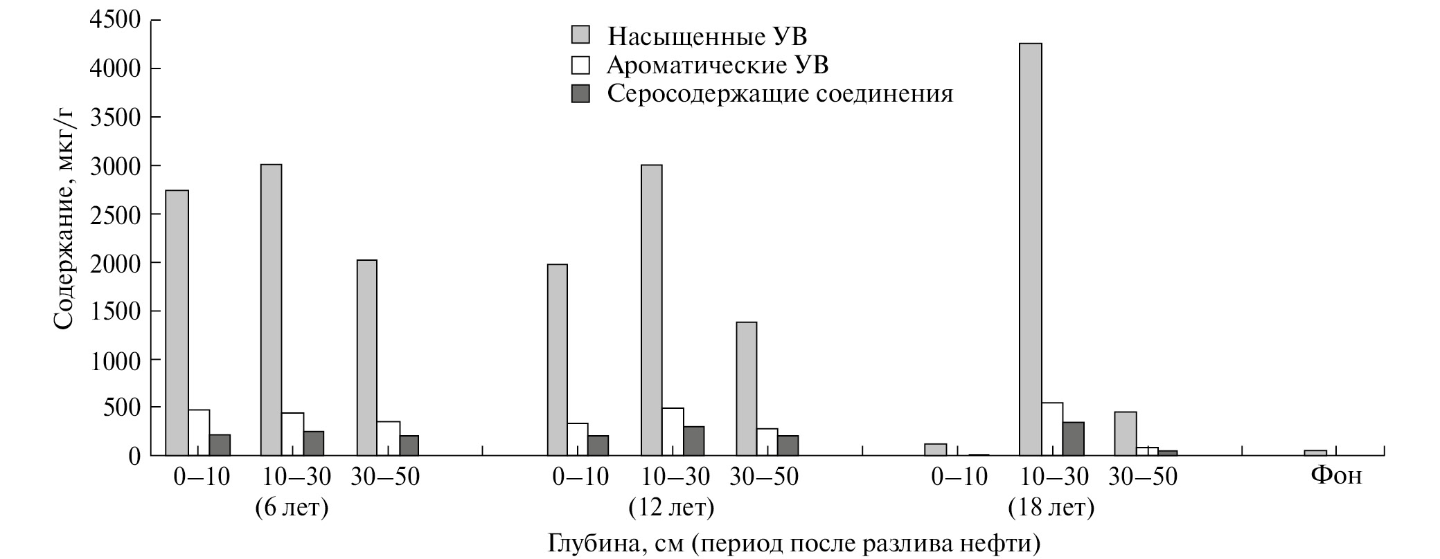 В разрезе торфяной почвы (0–50 см) через 6 лет после попадания на нее нефти максимальное количество нефтяных соединений содержится в верхних 30 см. С увеличением времени после загрязнения нефтяные компоненты концентрируются в слое 10–30 см. В нижних 30–50 см на фоне снижения общей концентрации нефтяных соединений, в их составе увеличивается доля ароматических структур, преимущественно полиметилзамещенных.