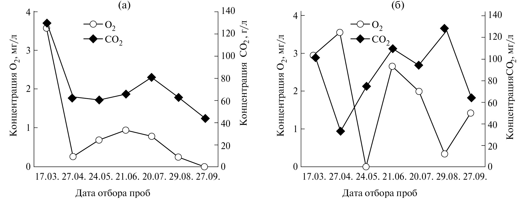 Химический анализ болотных вод показал, что концентрация растворенного кислорода и углекислого газа в водах фонового и горелого участка изменялась неодинаково: в воде фонового участка максимальная концентрация О2 (3.58 мг/л) отмечена в период снеготаяния в апреле, а в сентябре – снизилась до нуля. Динамика концентрации СО2 в воде фонового участка имела похожую форму (рис. 1, а). В воде на месте после пожара повышенным концентрациям О2 соответствовали минимальные количества СО2, и их содержание менялось скачкообразно (рис. 1, б).