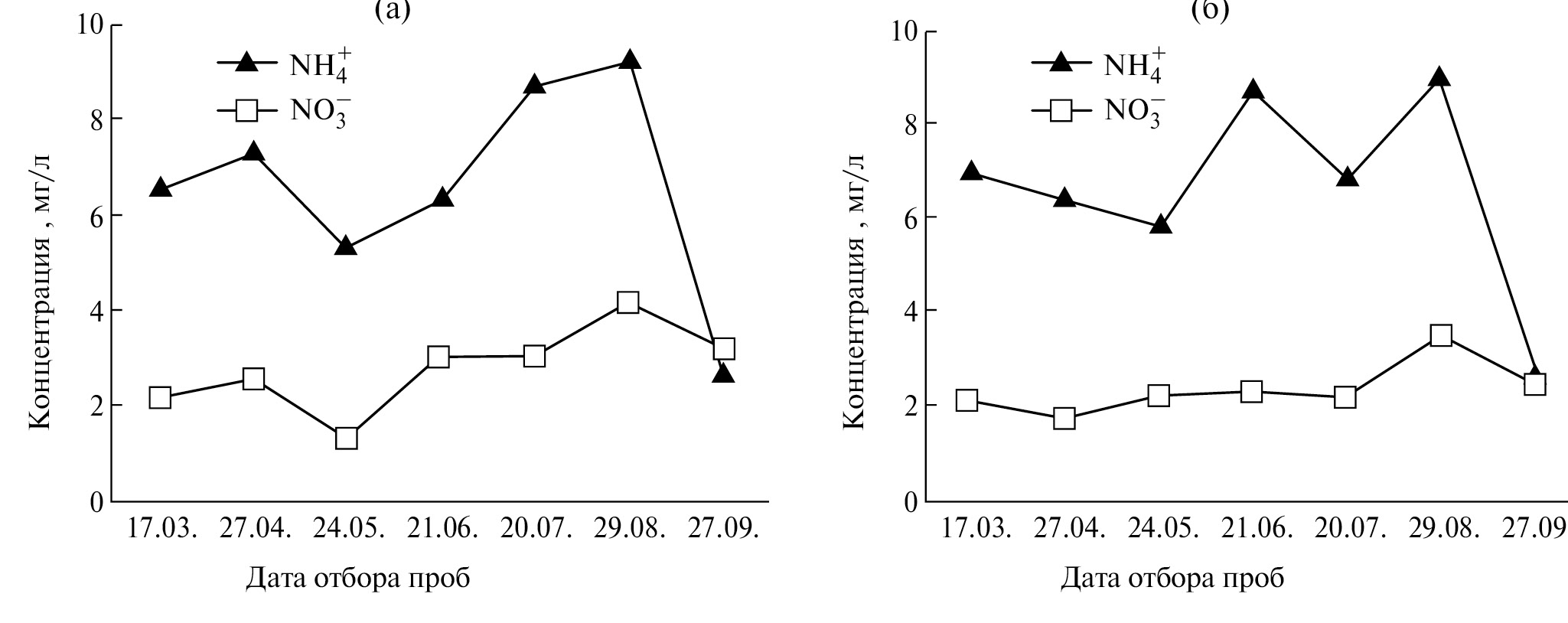 Содержание иона аммония и нитрат-иона в воде фонового и постпирогенного участков менялось в течение сезона сходным образом, с максимальными значениями в июне–августе и снижением до минимума в конце сентября (рис. 3а, б).