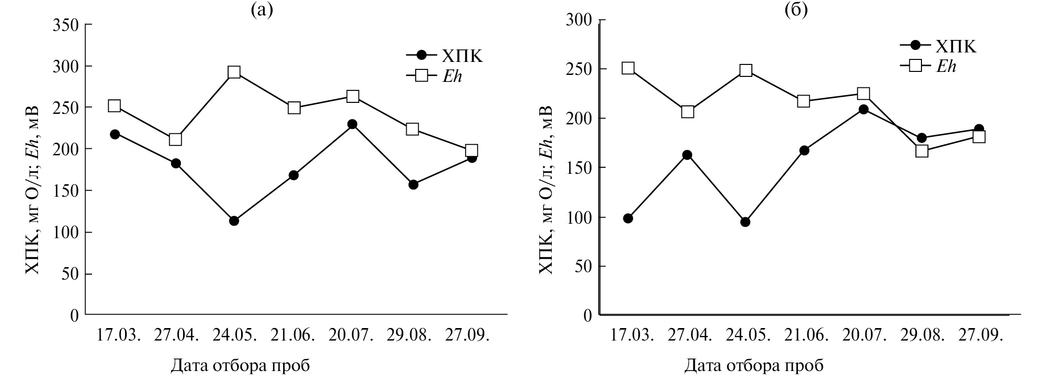 Сезонные закономерности изменения ХПК и Eh болотных вод фонового и постпирогенного участков отличались сниженной ХПК на постпирогенном участке в начале анализируемого периода, затем картина была сходной до конца сезона (рис. 2а, б).