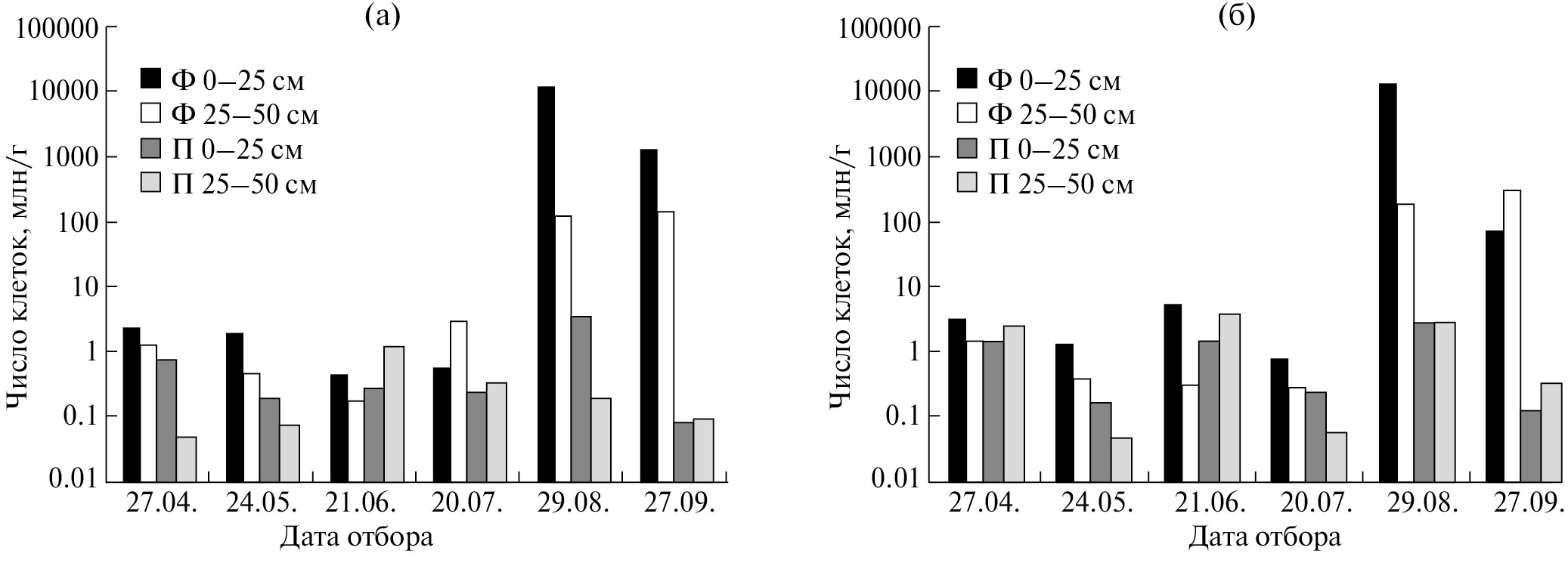 Рис. 4. Динамика численности аммонифицирующей (а) и педотрофной (б) микрофлоры в торфе осушенного фонового и постпирогенного участков Бакчарского болота в течение сезона 2022 г.