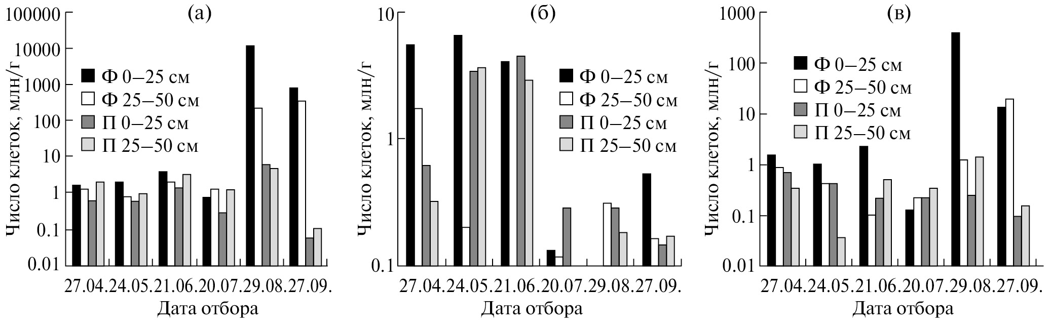 В пробах торфа определяли содержание микрофлоры разных физиологических групп: аммонифицирующей (АМ) – на мясопептонном агаре [7]; педотрофной (ПМ), разрушающей гуминовые вещества – на почвенном агаре; олиготрофной (ОМ), нуждающейся в минимальных концентрациях углерода и азота, – на голодном агаре [8]; углеводородокисляющих бактерий (УОБ) – на агаризованной среде Мюнца с нефтью в качестве единственного источника углерода и энергии [6]; целлюлозоразрушающей микрофлоры (ЦМ) – на агаризованной минеральной среде Омелянского с бумажным фильтром [8]; анаэробных серувосстанавливающих бактерий (СВБ), использующих сульфат-ион в качестве терминального акцептора электронов и восстанавливающих сульфаты до сульфидов, – на среде Таусона [9]; денитрифицирующих бактерий (ДНБ), использующих нитрат-ион в качестве терминального акцептора электронов, на среде Гильтая [6].