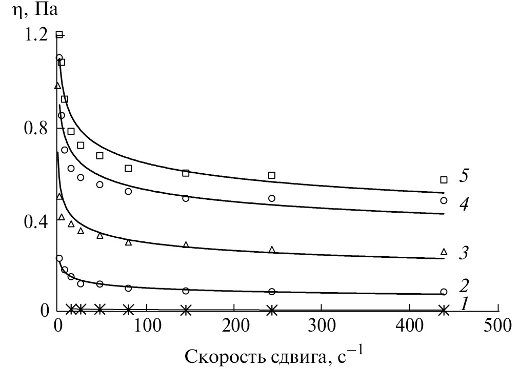 2. Fig. 1. Dependence of dynamic viscosity of PVA solutions (C = 100 kg/m3) on shear rate at 20°C, where molecular mass of polymer samples: (1) 25,000 (degree of hydrolysis 88%); (2) 25,000; (3) 46,000; (4) 54,000; (5) 59,000