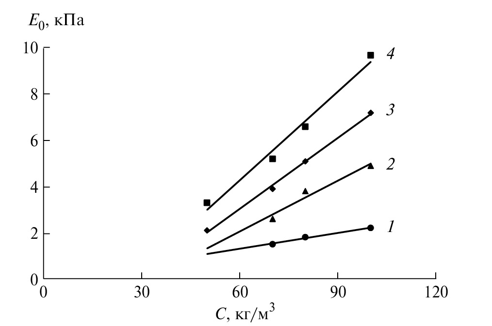 Из рис. 3 видно, что после цикла замораживания–оттаивания из концентрированных растворов полимеров (С = 100 кг/м3) с наиболее высокой молекулярной массой (М = 59 × 103) образуются самые упругие криогели с максимальным значением мгновенного модуля упругости (Е0). Криогели из образцов ПВС с малыми молекулярными массами (М1 = 25 × 103 и М2 = 46 × 103) из растворов низкой концентрации полимера (С = 50 кг/м3) сформировать не удалось. Исследование температуры плавления показало, что для всех образцов криогелей она составляет примерно 70°С.