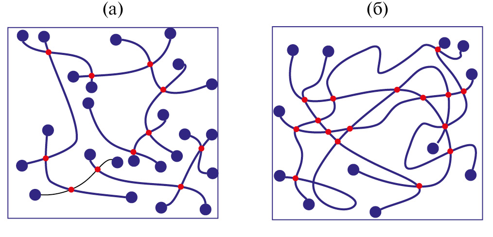 Эта закономерность свидетельствует, чем длиннее полимерные цепи и чем большее число макромолекул поливинилового спирта содержится в матрице криогеля, тем больше времени требуется для приближения системы к состоянию равновесия. Этот экспериментально наблюдаемый факт объясняется тем, что у более длинных и взаимно переплетенных полимерных цепей значительно больше межмолекулярных контактов между собой, поэтому для перестройки всего полимерного каркаса криогеля требуется значительно больший интервал времени (рис. 4, б). Макромолекулы с малыми молекулярными массами и короткими полимерными цепями (рис. 4, а) формируют менее прочный полимерный каркас, у которого модуль упругости (Е) имеет невысокие значения (рис. 3). В ячейках криогелей между переплетенными цепями находится множество маленьких молекул растворителя (вода), суммарная масса которых в зависимости от концентрации исходного раствора полимера составляет 95–90% от массы всего криогеля.