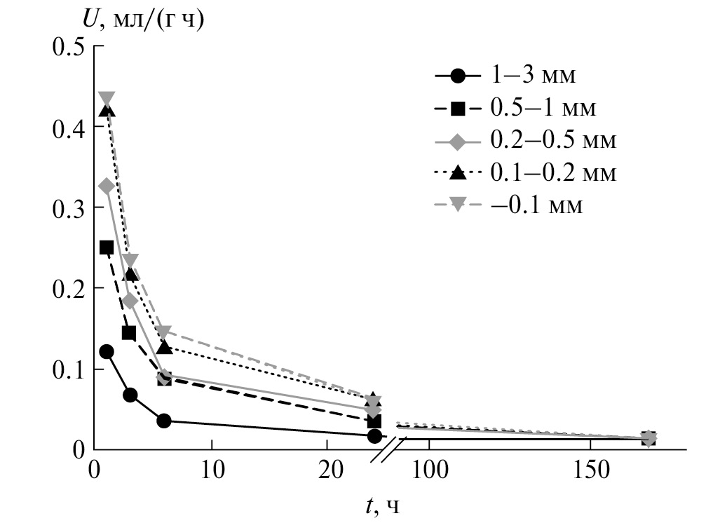 Влияние гранулометрического состава. Результаты изменения скорости сорбции кислорода для угля марки Д крупностью от 0.1 до 3 мм представлены на рис. 2. Кинетические кривые окисления всех угольных фракций демонстрируют тенденцию к уменьшению скорости поглощения кислорода с увеличением продолжительности процесса и выходят на стационарный режим после 4 сут от начала процесса.