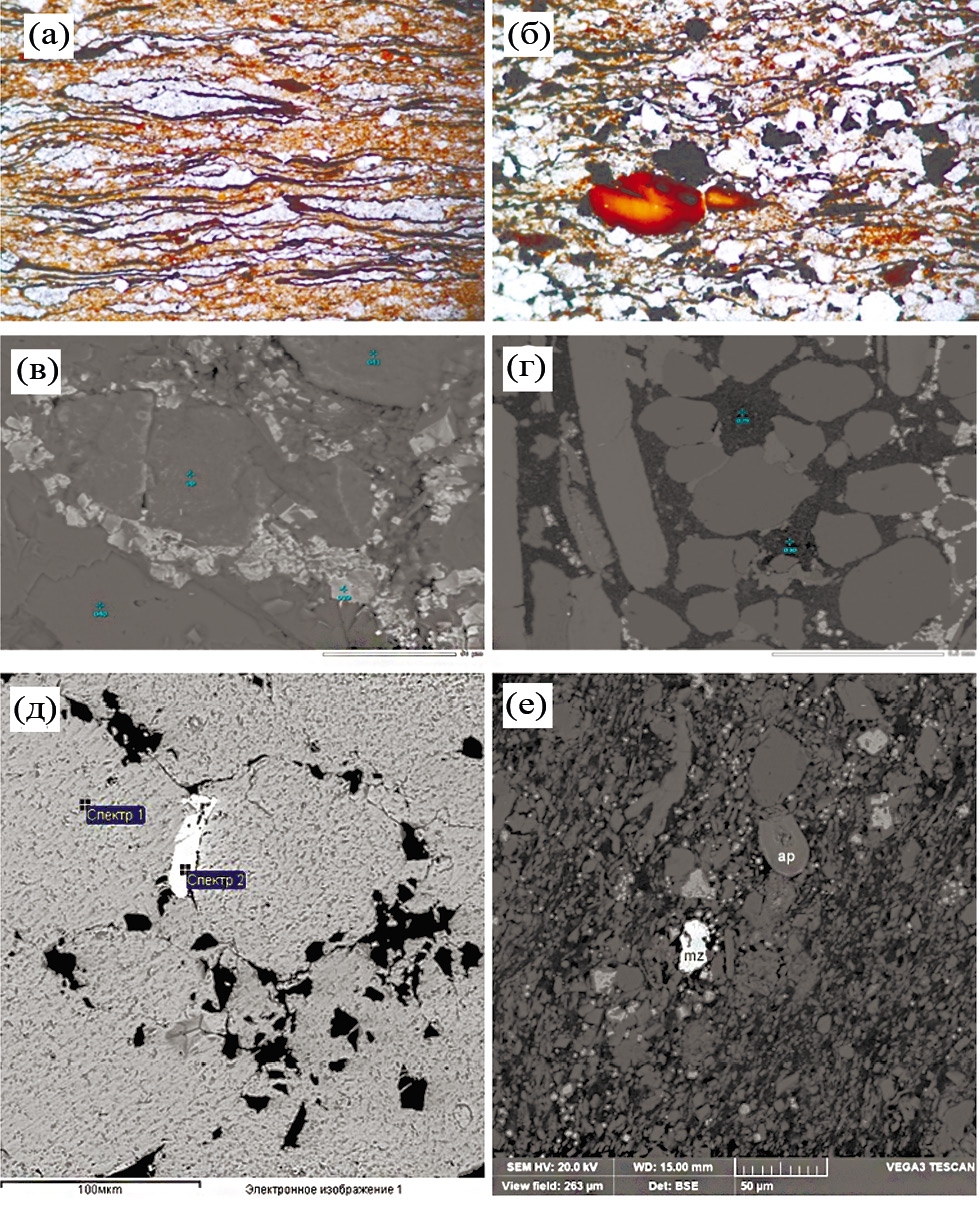 Рис. 1. Петрографический состав диктионемовых сланцев: а – теки граптолитов, огибают алевритовые гнезда. Николи II, увеличение 200; б – фосфатные конкреции. Николи II, увеличение 200; в – фторапатит (вверху справа), пирит (светло-серый), кальцит (внизу); г – апатит (серое), кварц (темно-серое), пирит (светло-серое), органическое вещество (черное); д – монацит (белое) в натечно-зональном пирите из диктионемовых сланцев; е – апатит (ap) и монацит (mz).
