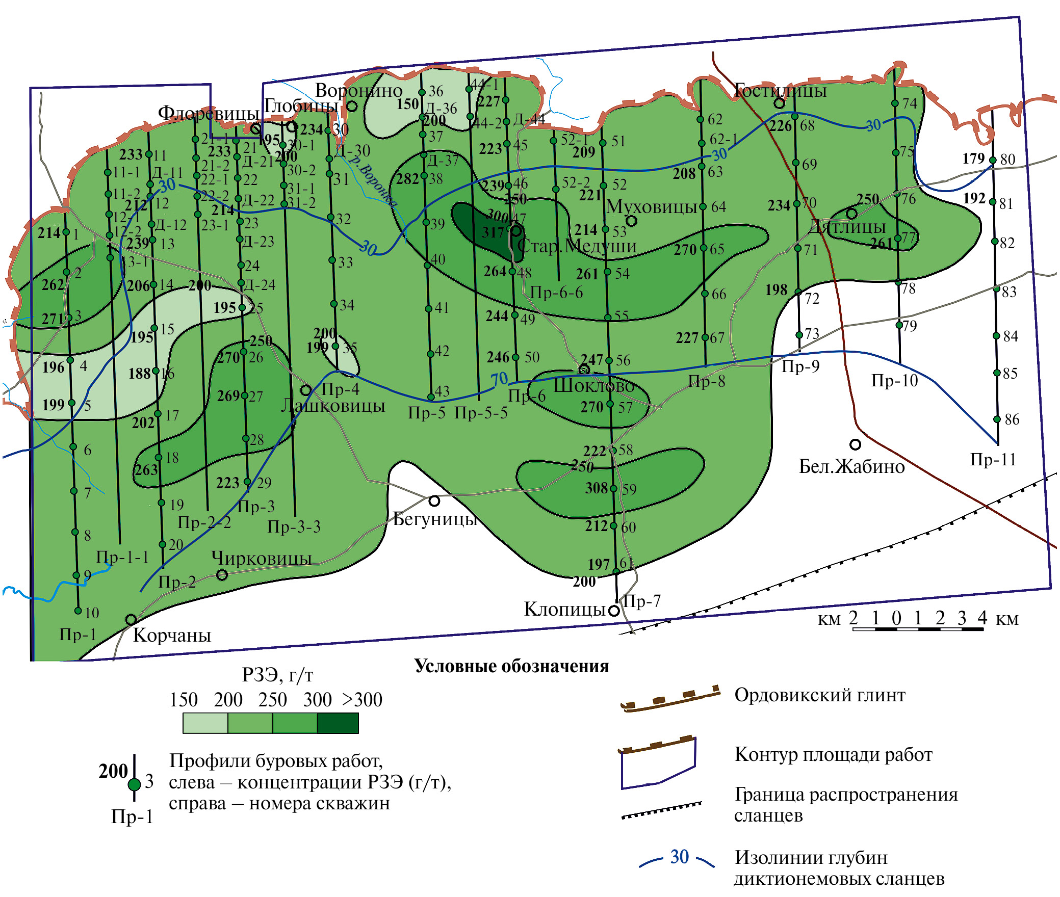 РЗЭ на площади развития пласта диктионемовых сланцев распространены относительно равномерно, выделяются крупные участки с содержанием РЗЭ от 250 до 300 г/т, линзовидной формы и один – более 300 г/т.