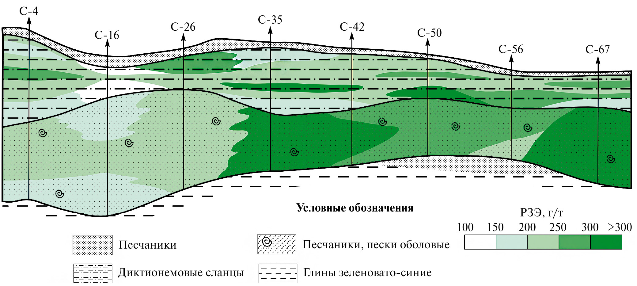 Рис. 3. Распределение РЗЭ в разрезе пласта диктионемовых сланцев и оболовых песчаников по профилю скважин С-4–С-67. Масштаб горизонтальный 1 : 100 000, вертикальный для сланцев и песчаников 1 : 100, для надсланцевой толщи – 1 : 1000.