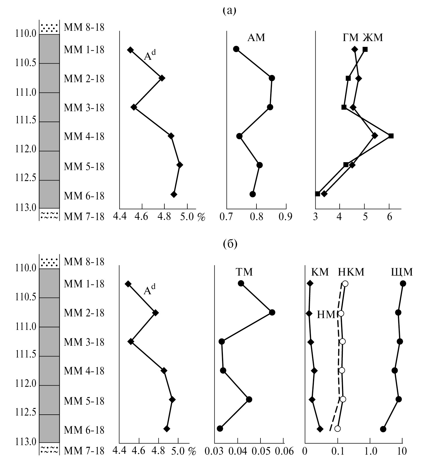 Рис. 1. Графики распределения показателей в колонке угольного пласта из шахты: (а) Ad, АМ, ГМ и ЖМ; (б) Ad, ТМ, КМ, НМ, НКМ и ЩМ.