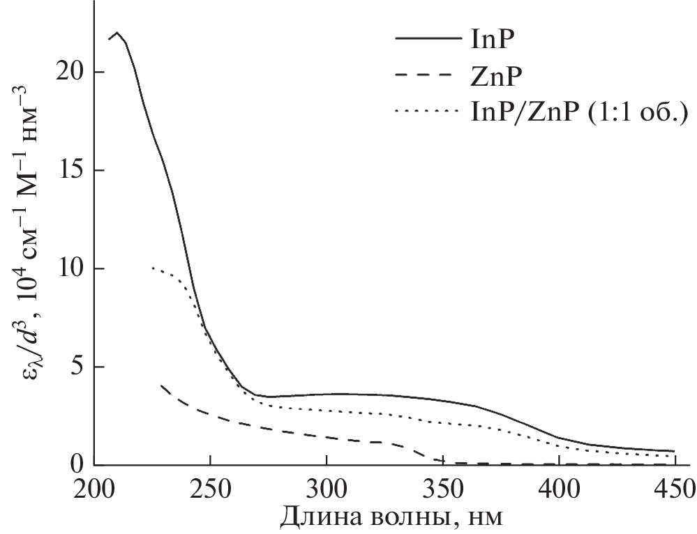 The molar absorption coefficients of spherical InP, ZnS, and InP(core)/ZnS(shell) nanoparticles have been calculated from the complex permittivities of the corresponding bulk semiconductors. The results are valid in the short-wavelength region of the absorption spectrum, where the quantum size effect is insignificant. For the imaginary part of the polarizability of core/shell nanoparticles, a formula has been obtained that is convenient for calculations in real numbers