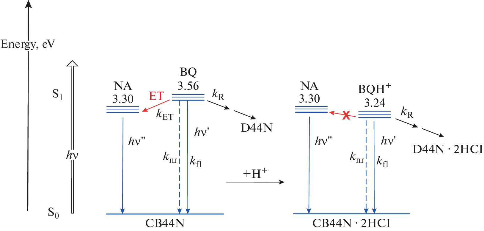 The photophysical and photochemical properties of the protonated forms of both covalently bound biphotochromic dyad D44N containing two styrylbenzo[f]quinoline (SBQ) photochromes and corresponding cyclobutane CB44N containing two benzo[f]quinoline (BQ) substituents have been studied. CB44N is formed from D44N as a result of a reversible [2+2] photocycloaddition (PCA) reaction. The dyad and cyclobutane contain the 3-hydroxy-2-naphthoic acid (NA) moiety as a bridging group. It has been shown that the protonation of nitrogen atoms in the SBQ and BQ groups leads to bathochromic shifts in the absorption spectra and bathofloral shifts in the fluorescence spectra of the dyad and cyclobutane. In the protonated dyad, the quantum yield of the PCA reaction decreases, presumably due to the Coulomb repulsion, which prevents the cations of the protonated SBQ photochromes from approaching each other. In protonated cyclobutane, the quantum yield of the reverse four-membered ring opening reaction (retro-PCA), on the contrary, increases due to the absence of a competitive process of energy transfer from BQ to NA, which was previously observed in neutral cyclobutane