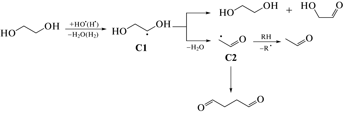 This study is devoted to the effect of complete deuteration of the ethylene glycol carbon skeleton on the formation of its radiation-induced free-radical transformations products in deaerated aqueous solutions at pH 7.00 ± 0.10 and a dose rate of 0.064 ± 0.002 Gy/s. It has been established that the chain process of fragmentation of carbon-centered ethylene glycol radicals (∙CH(OH)CH2OH) plays an important role in the formation of acetaldehyde. The replacement of protium atoms located at carbon atoms by deuterium decreased the radiation-chemical yield of acetaldehyde in aqueous 1 M solutions of diols by a factor of 8. The results of this study indicate that the use of deuterium exchange at the carbon skeleton of organic molecules is a promising way for increasing their resistance to radiation-induced free radical fragmentation processes.