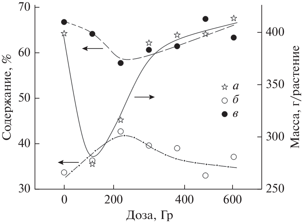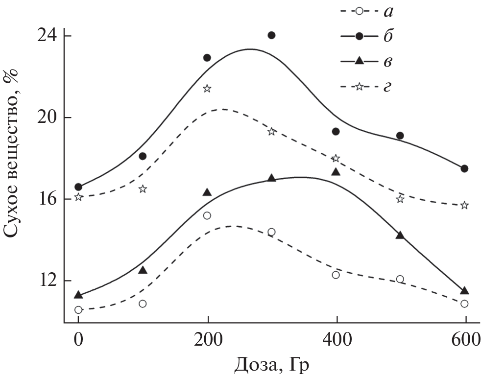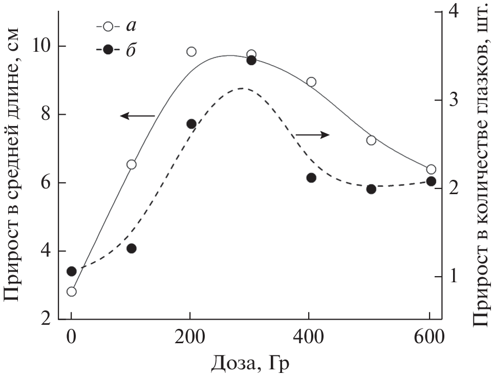 Formation of the potato crop in soddy podzolic soils of the Field Experimental Station of the Russian State Agrarian University—Timiryazev Moscow Agricultural Academy has shown that doses of 200–300 Gy used for the irradiation of seed tubers are most favorable for stimulating the growth and development of potato plants of the Meteor variety. After this radiation treatment of the seed material, the greatest increase was observed in the length of eyes, in the number of eyes and stems, in the amount of photosynthetic active biomass, in the solids content of leaves and stems, and in the amount of starch in the tubers of grown potatoes. All this can be used to increase the yield of potatoes and their consumer qualities