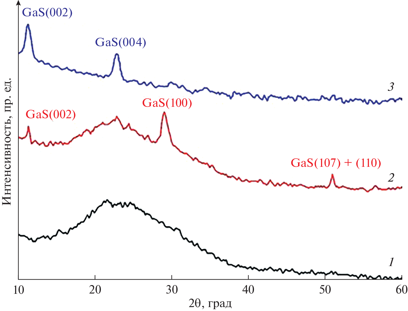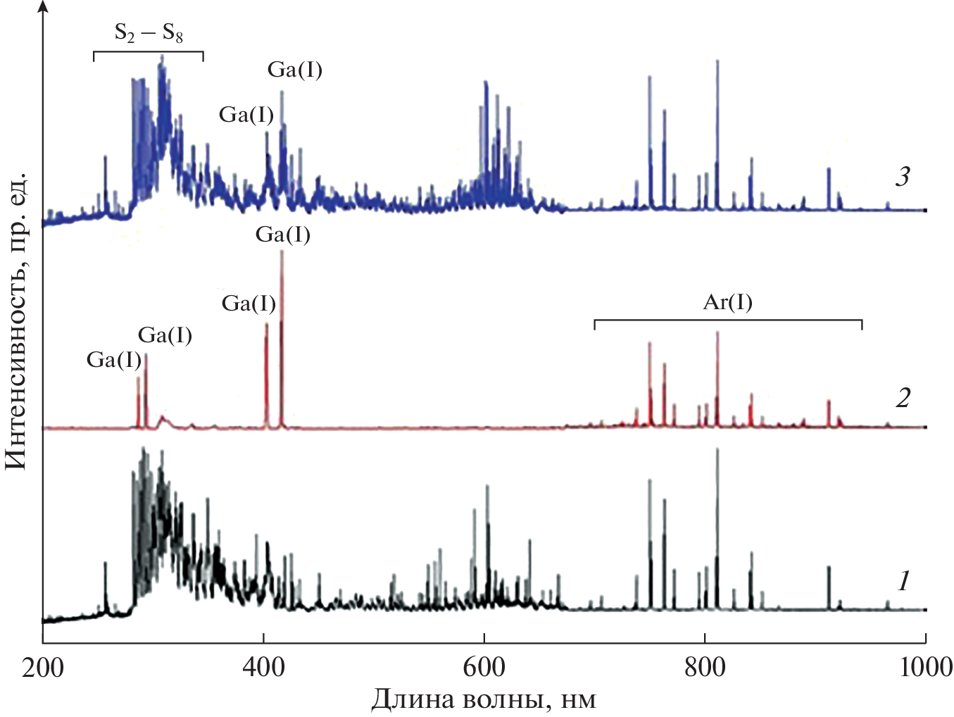 Gallium monosulfide (GaS), a representative of Group III monochalcogenide layered materials, is a wide-bandgap semiconductor. It is considered an ideal material for light detectors in the blue and near ultraviolet ranges of the spectrum. In this work, for the first time, the method of plasma-enhanced chemical vapor deposition (PECVD) was applied to obtain thin GaS films on various substrates, where high-purity gallium and sulfur served as starting materials. To initiate the interaction between the reactants, a nonequilibrium RF discharge (40.68 MHz) plasma at a pressure of 0.1 torr was used. The influence of the substrate nature on the stoichiometry, structure, and surface morphology of GaS films has been studied. The plasmachemical process was monitored using optical emission spectroscopy.