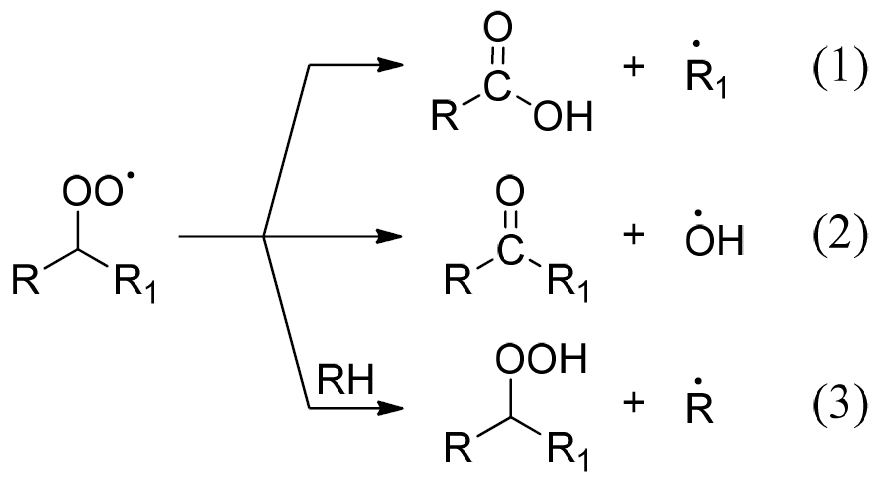 Окисление на поверхности интенсивнее из-за максимальной концентрации О2, более быстрого восполнения кислорода и более низкой вероятности рекомбинации макрорадикалов. Степень окисления также может возрастать в пост-радиационных процессах за счет миграции радикальных центров из объема к поверхности пластика. Гибель ROO · включает три конкурирующих реакции (где R и R1 полимерные группы):