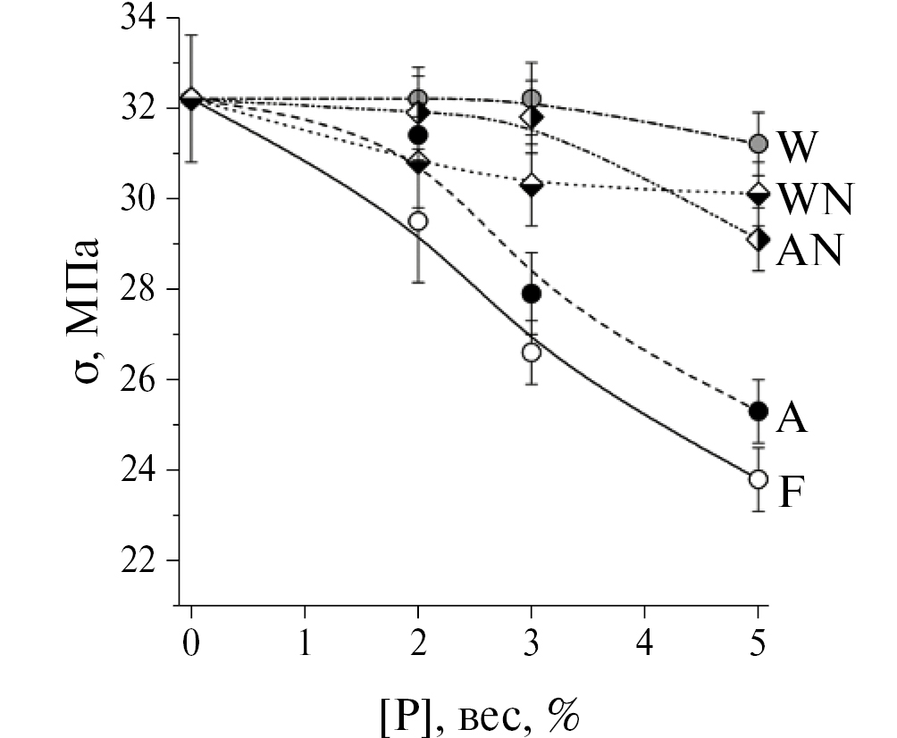 Рис. 1. Прочность на сжатие s для ЦППК в зависимости от содержания [P] и режима обработки порошка ПЭВП. Схожие зависимости наблюдаются в случае порошков ПП, ПС и ПЭТФ.