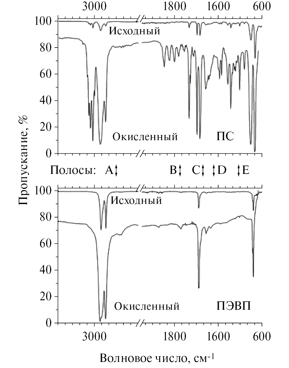 Появление карбоксилов среди кислород-содержащих групп в облученном пластике выявляется по наличию пяти характеристических полос на ИК-спектре (рис. 4): А — широкая полоса или группа полос при 3300–2500 см-1, соответствующая связанной группе ОН; B — полоса при 1760–1680 см-1, относящаяся к группам СH2–C(О)ОH, C=C–C(O)OH или Ar–C(O)OH (где Ar — арил); С — полоса при 1440–1395 см-1, соответствующая колебаниям О–Н (δOH); D — полоса при 1320–1210 см-1, указывающая на колебания С–О (nС–О); и Е — широкая полоса при 955–890 см-1, относящаяся к неплоским деформационным колебаниям ОН (δOH). Все эти полосы обнаруживаются на ИК-спектрах пластиков, облученных на воздухе. Рисунок 4 демонстрирует соответствующие изменения ИК-спектра для случая ПЭВП и ПС.
