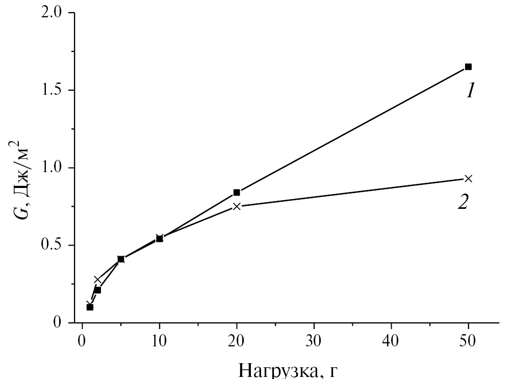Рис. 2. Зависимости удельной энергии отслаивания G от величины нагрузки для пленок фоторезиста SPR700 толщиной 1.2 мкм исходных (1) и облученных электронами флюенсом 3 × 1016 см-2 (2).