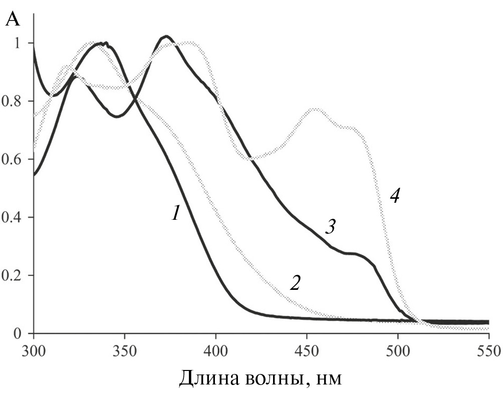 Рис. 1. Нормированные спектры поглощения I (1, 2) и III (3, 4) в толуоле (1, 3) и этаноле (2, 4).