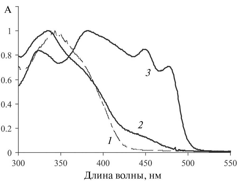 Рис. 2. Нормированные спектры поглощения II в толуоле (1), этаноле (2) и IV в толуоле (3).