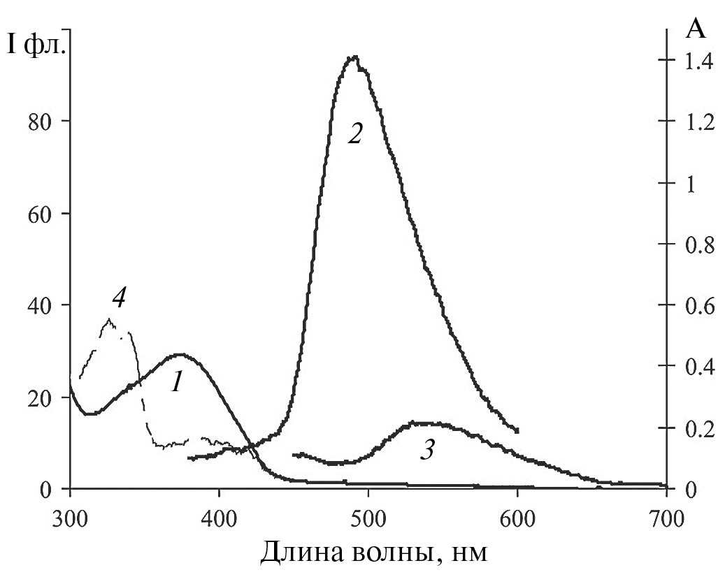 Рис. 3. Спектры поглощения (1) и люминесценции (2–4) соединения V в толуоле, Em: λ возб = 330 нм (2), 375 нм (3) и Ex: λ рег = 550 нм (4).