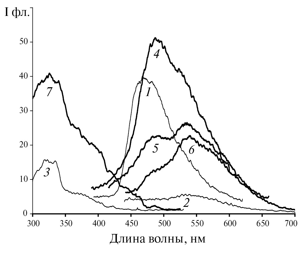 Рис. 4. Спектры люминесценции и I (1–3) и II (4–7) в толуоле, Em: λ возб = 330 нм (1), 380 нм (2), Ex: λ рег = 480, 540 нм (3), Em: λ возб = 340 нм (4), 360 нм (5), 380 нм (6) и Ex: λ рег 535 (7).