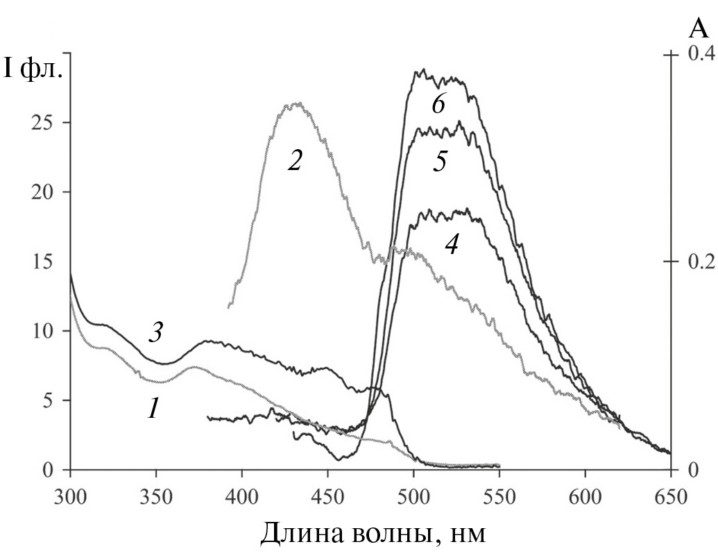 Рис. 6. Спектр поглощения (1) и люминесценции (2) III в толуоле Em: λ возб = 330 нм (2) и спектры поглощения (3) и люминесценции (4–6) IV в толуоле Em: λ возб = 330 нм (4), 365 нм (5), 420 нм (6).