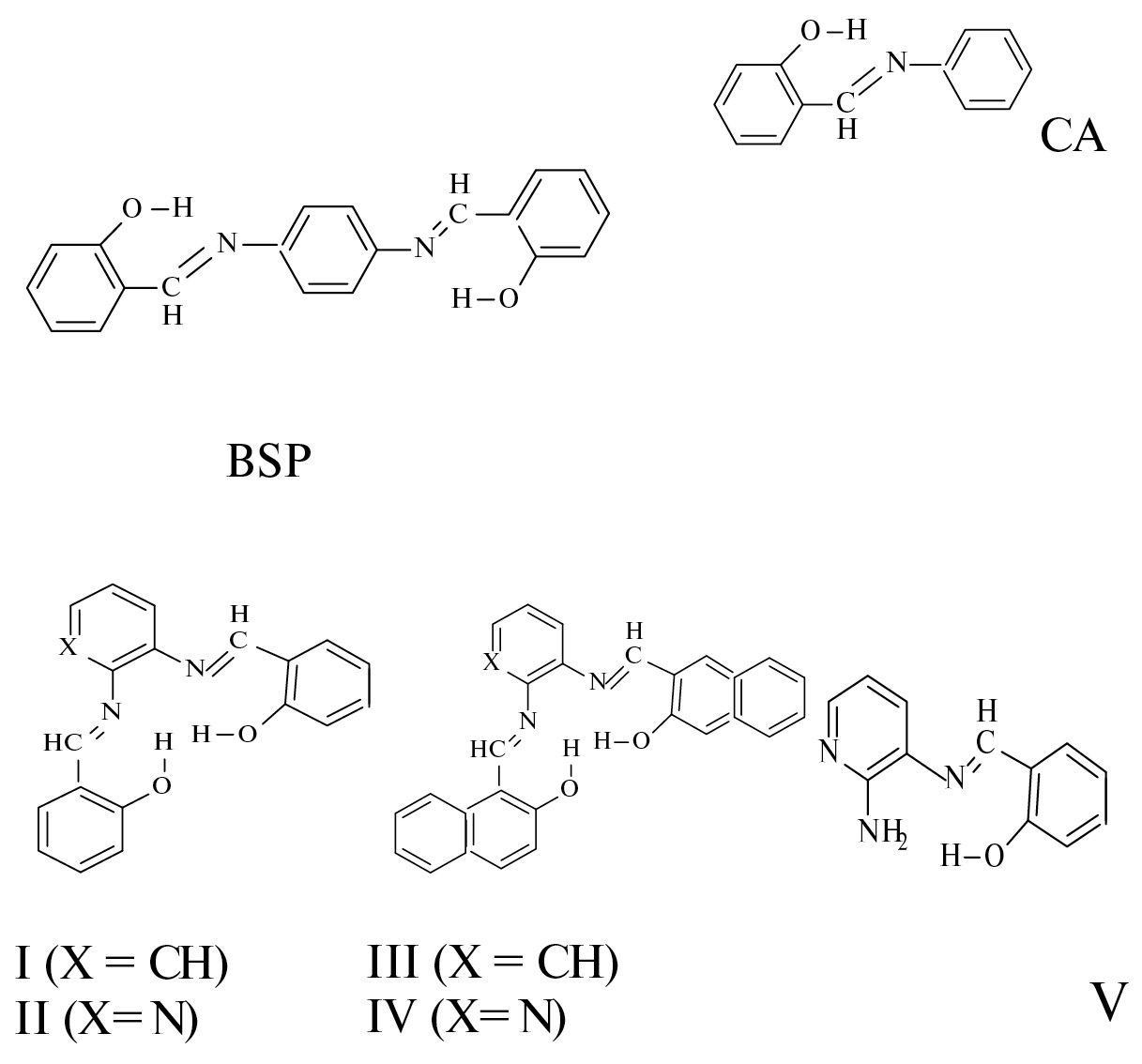 Способ организации угловых бисструктур, исследуемых в настоящей работе, аналогичен формированию BSP – азометиновые фрагменты имеют общую аминную часть, однако в отличие от линейной структуры BSP азометиновые группировки находятся в соседних позициях бензо- или пиридинового кольца аминной части, образуя “угловую” структуру.
