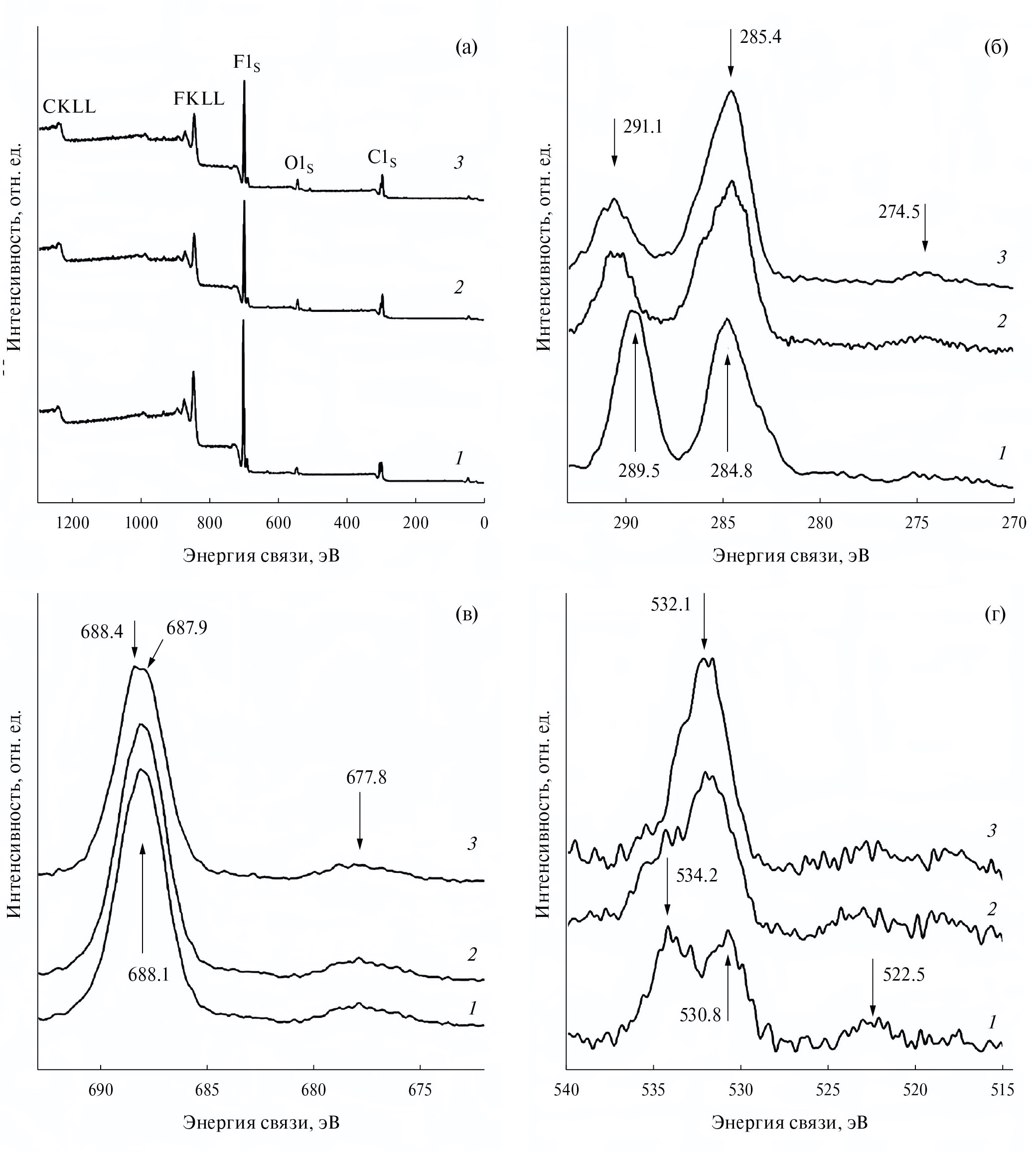 На рис. 1а (спектр 1) представлен обзорный РФЭ-спектр исходного ЭТФЭ. На нем помимо углеродного (С1s) и фторного (F1s) пиков появляется также пик кислорода (O1s). Кислород, регистрируемый на РФЭ-спектре исходного ЭТФЭ, видимо, является примесью. Регистрируемый в спектре ЭТФЭ пик C1s можно разложить на C−C (289.5 эВ) и C−F2 (284.8 эВ) (рис. 1б, спектр 1). Как видно, линия С1s с энергией связи 289.5 эВ, соответствует атомам углерода, входящим в состав группы CF2. Пик, наблюдающийся при Есв = 284.8 эВ относится к С1s-электронам C−C группы. В РФЭ-спектре F1s (рис. 1в, спектр 1) регистрируется интенсивный пик С−F2 (688.1 эВ) и малоинтенсивный пик при 677.8 эВ. Энергия связи 689.1 эВ, которая близка к значению 688.1 эВ в РФЭ- спектре ЭТФЭ, является типичной для F1s в ПТФЭ и соответствует связи C−F2 [6, 7].