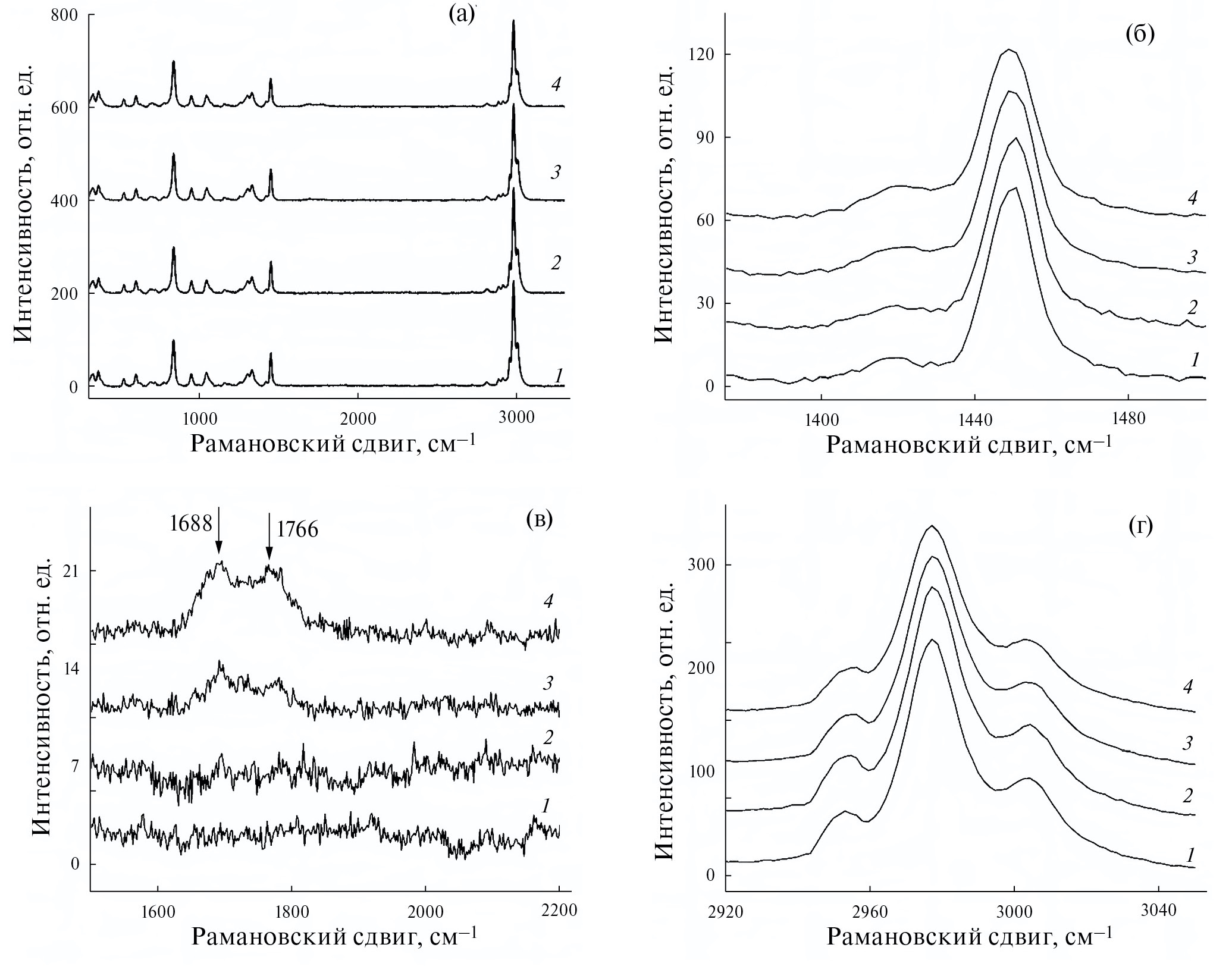 В ходе радиолиза в рамановских спектрах ЭТФЭ появляются полосы, приписываемые валентным колебаниям связей С=О (1688 см–1) и С=С (1766 см–1). Интенсивность этих полос растет с увеличением дозы облучения (рис. 3в). Образование подобных фрагментов также отмечено в цепи облученного ЭТФЭ в работах [13–15].