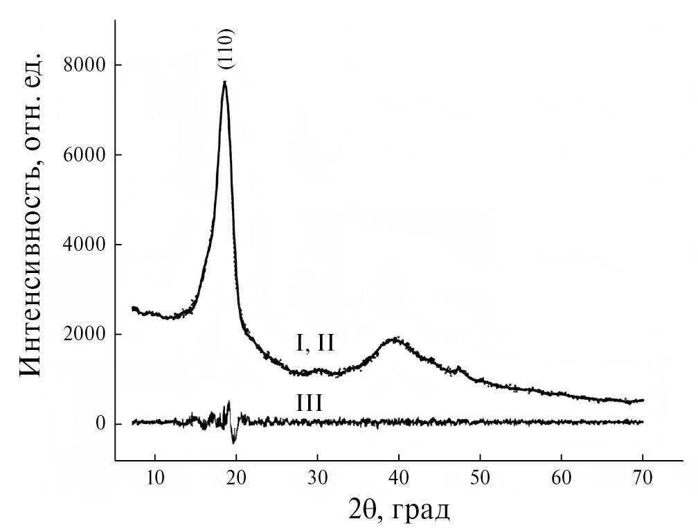 Рис. 1. Рентгенограмма ЭТФЭ с триклинной фазой (пр. гр. P-1): I – экспериментальные и расчетные данные; II – Брэгговские отражения; III – разностная кривая между экспериментальными и расчетными данными.