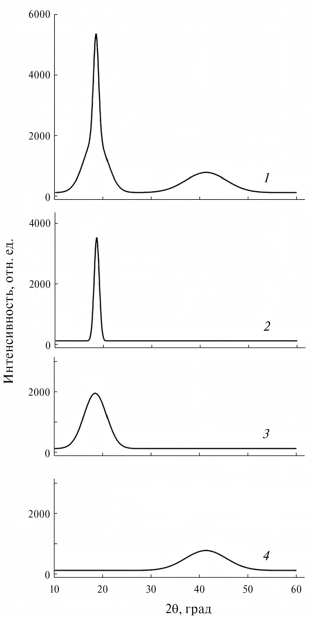 Рис. 3. Разделение пиков кристаллической (2) и аморфных (3, 4) фаз облученного дозой 50 кГр сополимера (1).