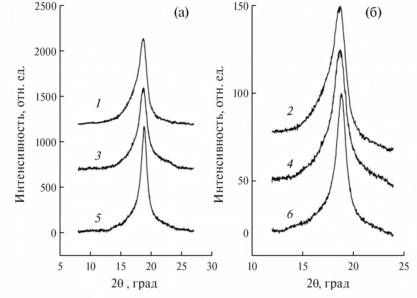 Рис. 4. Рентгенограммы в областях 2θ = 8°–26° (а) и 2θБ = 12°–24° (нормированная по рефлексу (110)) (б) образцов исходного ЭТФЭ (1, 2) и сополимера, облученного дозой (кГр): 50 (3, 4), 2000 (5, 6).