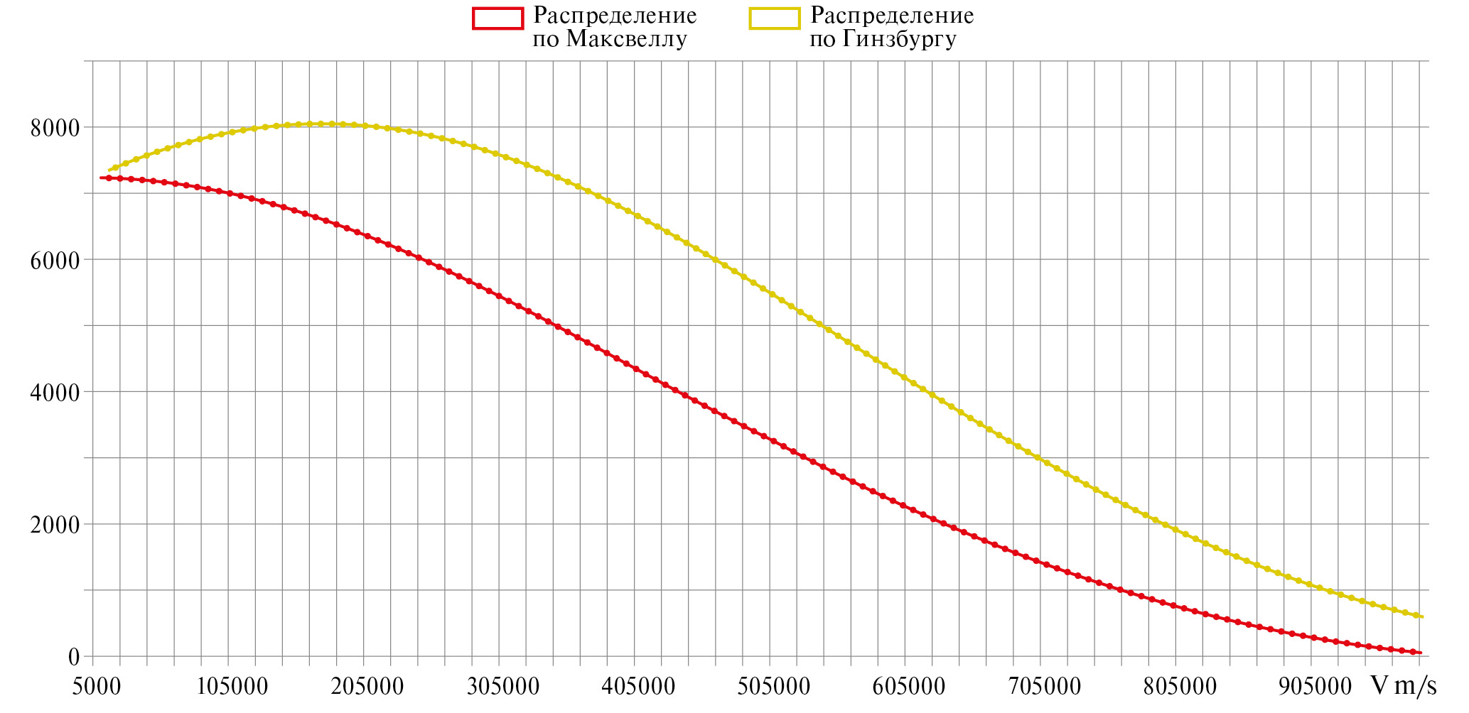 Рис. 3. Функция распределения электронов по скоростям в относительных единицах при nc = 5 × 107 Гц и f = 1.76 МГц.