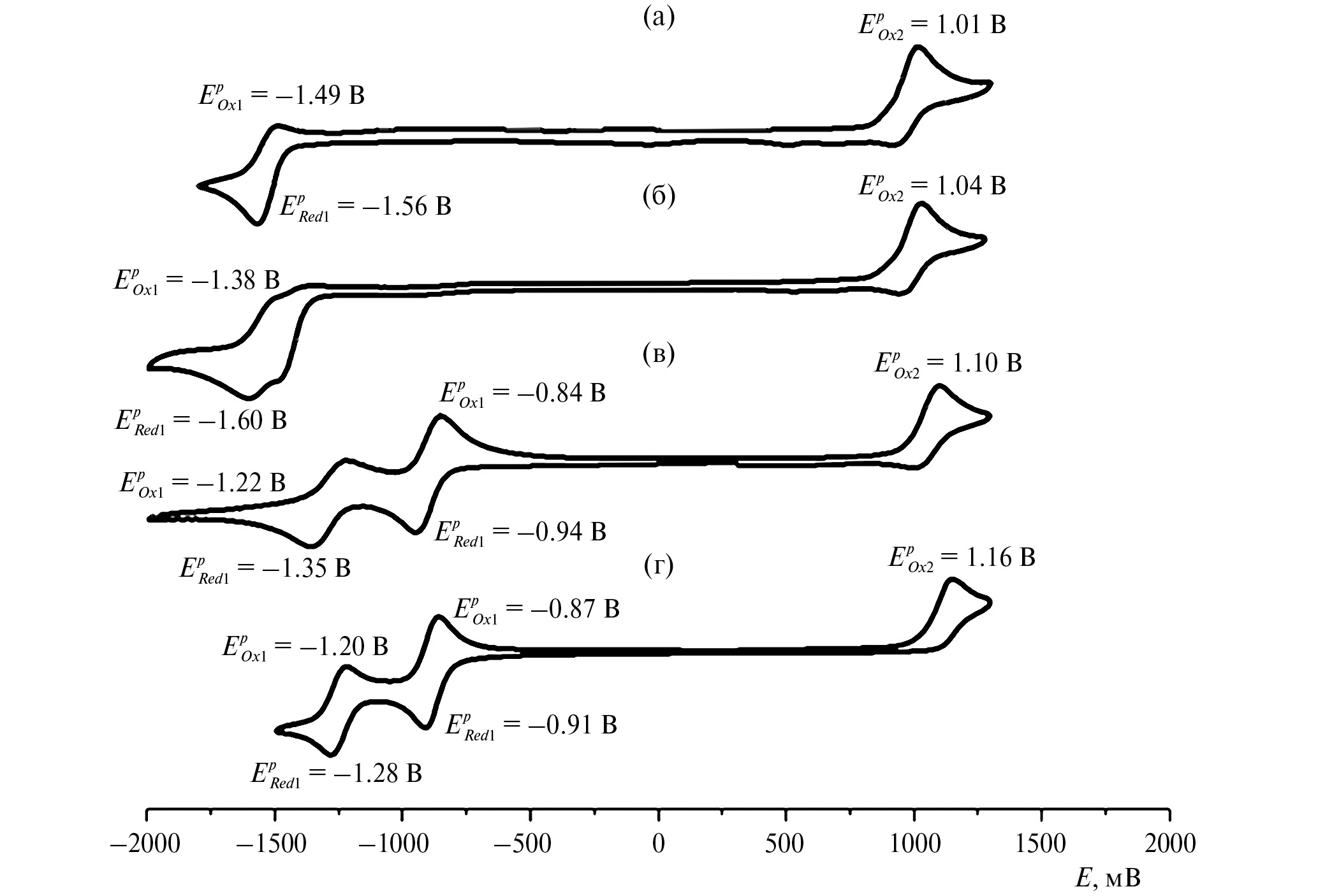 Электрохимические исследования. Окислительно-восстановительные потенциалы определяли методом циклической вольтамперометрии (ЦВА) в трехэлектродной ячейке (потенциостат-гальваностат PS-50 (SmartStat)) в атмосфере аргона. Рабочий электрод – неподвижный стеклоуглеродный электрод (d = 2 мм), вспомогательный электрод – платиновая проволока. Электрод сравнения Ag/AgCl/KCl (нас.) с водонепроницаемой диафрагмой. Скорости развертки потенциала составили: 0.05, 0.1, 0.2, 0.3, 0.4, 0.5 В с-1. Растворитель − ацетонитрил. Фоновый электролит – 0.1 М (NBu4)ClO4 (Aldrich), дважды перекристаллизованный из водного раствора этанола и высушенный в вакууме (48 ч) при 50°С.