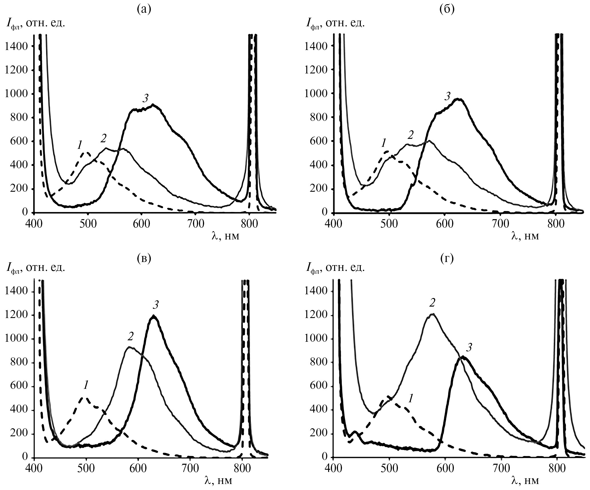 Рис. 2. Спектры люминесценции полимерных образцов на основе ПЭТА и азокрасителей 1 (а), 2 (б), 3 (в), 4 (г). На всех графиках: кривая 1 – полиПЭТА без азокрасителя; кривая 2 – спектр полиПЭТА с красителем, зарегистрированный при комнатной температуре; 3 – спектр полиПЭТА с красителем, зарегистрированный при 77 К. Длина волны возбуждения – 405 нм, мощность излучения – 100 мВт
