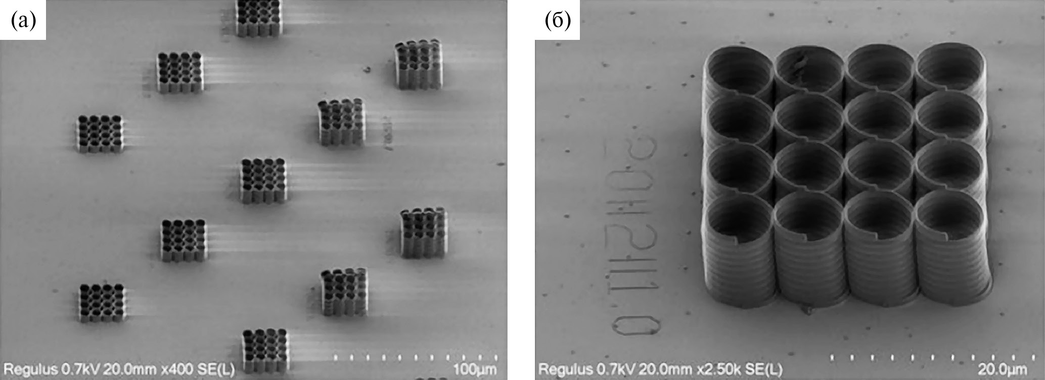 Изображения полимерных микроструктур, полученных на стеклянной подложке, фиксировали с использованием растрового электронного микроскопа сверхвысокого разрешения Regulus SU8100 (Hitachi, Япония). Образцы исследовали без нанесения проводящего покрытия при ускоряющем напряжении от 0.7 до 1.0 кВ.
