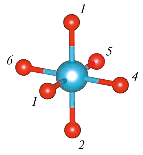 Первоначальная геометрия исследуемого алюмоиттриевого граната взята из базы данных [11], в которой приведена кубическая ячейка размером 12.0 × 12.0 × 12.0 Å. V = 1729.39 Å3, содержащая 160 атомов. В ячейке содержатся группы атомов AlO45-, AlO69-, YO813-. Длины связей и углы основных групп приведены в табл. 1 и 2. Для получения начальной геометрии и ее дальнейшей оптимизации по минимуму потенциальной энергии, число атомов было уменьшено со 160 до 36 при помощи масштабирующего множителя, встроенного в редактор PBC Editor программы gaussiew. Параметры ячейки составили значение 6.4 × 6.4 × 6.4 Å. Стехиометрический состав – Y6Al15O15 и рисунок начальной геометрии приведены на рис. 1б. Затем проведена оптимизация геометрии в соответствии с минимумом потенциальной энергии и выполнен расчет волновых чисел, полученной геометрии методом DFT/uPBEPBE/SDD (рис. 1б). В соответствии с рис. 1б в состав оптимизированной молекулы входит группа AlO69-, в которой кислород находится в октаэдрических позициях. Приведенная группа расположена в центре ячейки. Вокруг группы располагаются атомы алюминия и атомы иттрия в группах вида – AlO33-, YAlO22+. Следует отметить, атомы иттрия и алюминия в модели находятся в качестве краевых атомов, поэтому не наблюдаются группы AlO4, AlO6. Однако положения атомов Al и Y соответствуют модели молекулы, представленной в работе [11]. Сопоставление геометрии длин связей и углов для начальной геометрии с известными из эксперимента выполнено только для группы AlO69- и приведено в табл. 1.