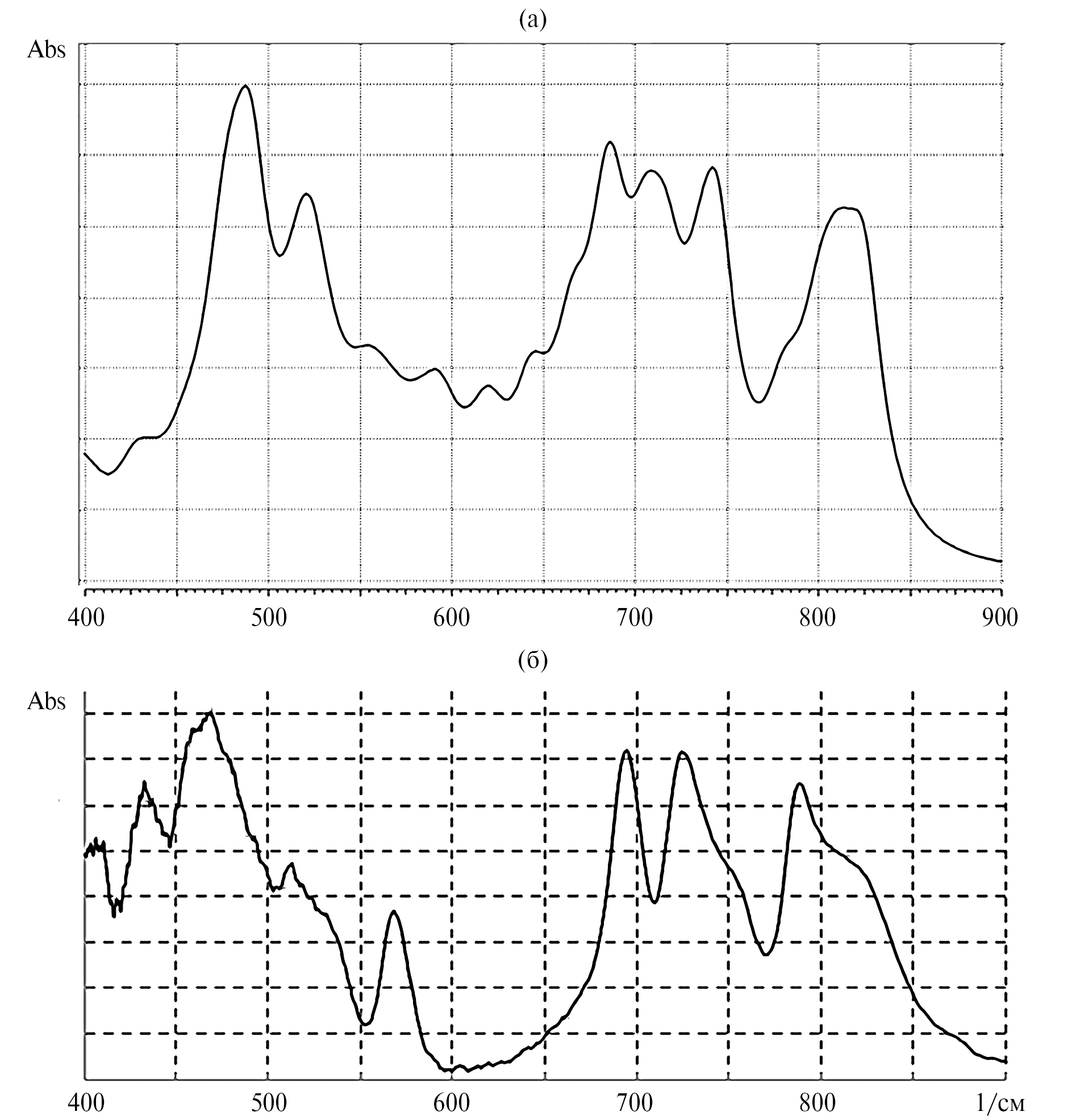 Рис. 3. (а) Рассчитанный ИК-спектр (состав Y7Al9O26: scale factor – 1.0 и FWHM = 12 cm-1), (б) зарегистрированный ИК-спектр алюмоиттриевого граната.