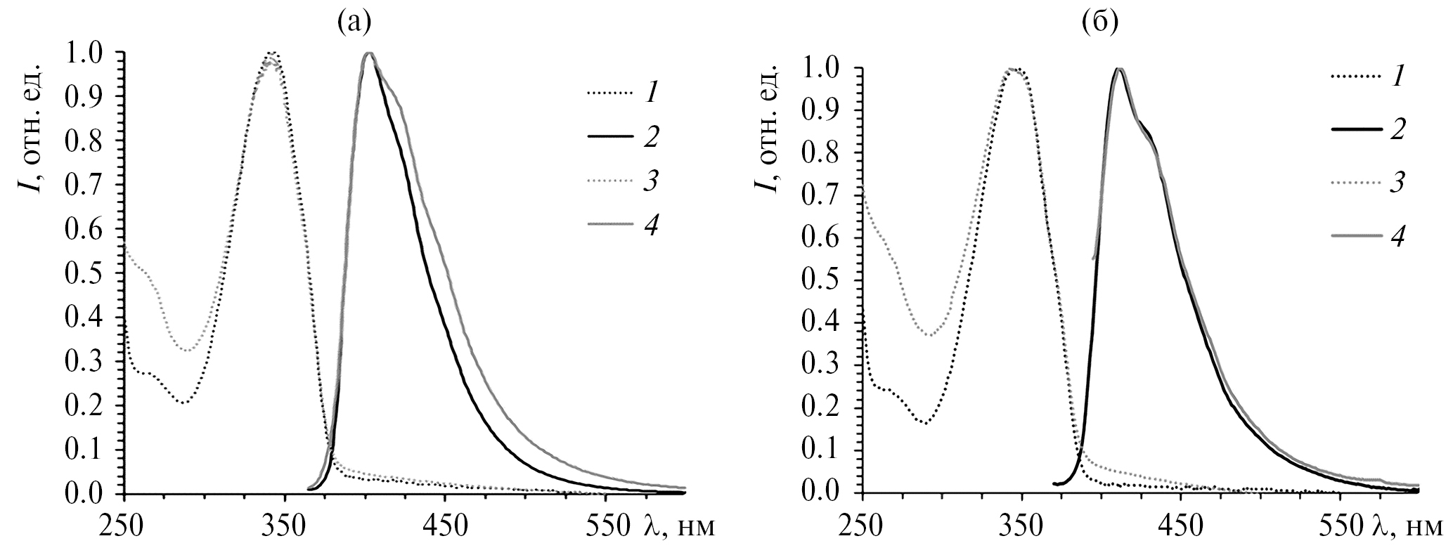 Рис. 2. Спектры 1c (а) и 2c (б) в матрице ПК при различных концентрациях люминофора: 1 – спектр поглощения при концентрации 0.05%; 2 – спектр люминесценции при концентрации 0.05%; 3 – спектр поглощения при концентрации 0.5 %; 4 – спектр люминесценции при концентрации 0.5%.