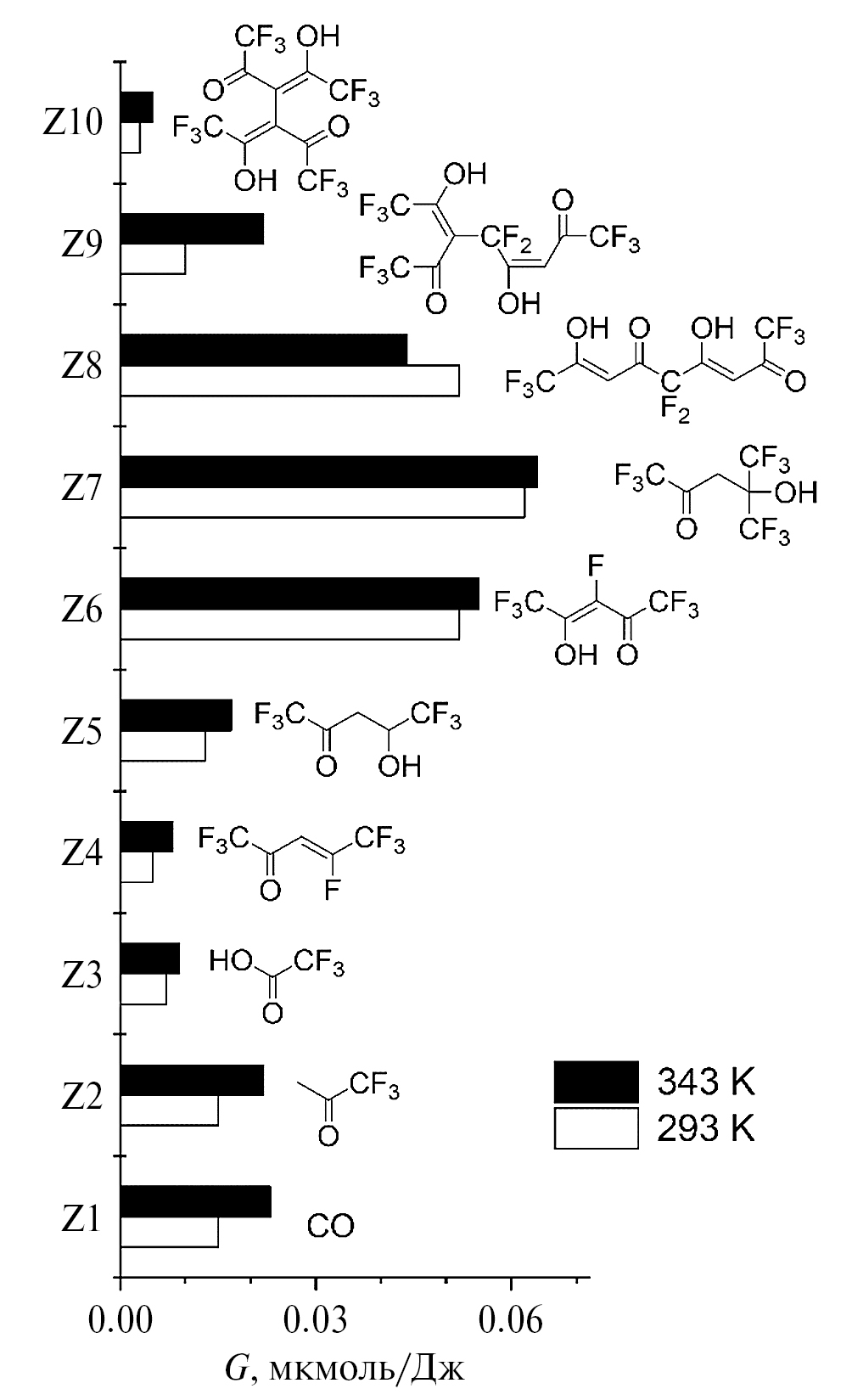 Главные молекулярные продукты радиолиза тяжелее, чем ГФАА (рис. 1). Их строение указывает, что радиолиз приводит к перераспределению групп CF3 (Z7, Z8 и Z9) и атомов F (Z6, Z8 и Z9). По-видимому, образование Z8-Z10 обусловлено рекомбинацией тяжелых радикалов, возникающих в результате отрыва F, CF3 или Н от молекулы ГФАА. Легкие продукты Z2 и Z3 обусловлены разрывом связи С(2)–С(3), при этом продукт Z3 свидетельствует о разрыве связи С–ОН. Продукт Z4 отличается от ГФАА замещением группы ОН на F, а продукт Z5 – отсутствием одной из двойных связей. Таким образом, главными продуктами являются: моноксид углерода (Z1), монокетоны (Z2 и Z4), кислота (Z3), кетоспирты (Z5 и Z7) и таутомерные тетракетоны (Z8–Z10).