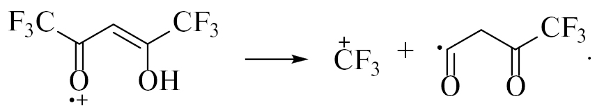 Такой распад закономерен, поскольку энергия разрыва связи С-СF3 около 4.45 эВ [15], энергия разрыва C–F около 5.7 эВ, а группа С(2)–С(4) стабилизирована за счет сопряжения связей. Движущей силой распада служит избыточная энергия катион-радикала (в среднем, 4 ± 2 эВ), приобретаемая вследствие ионизации с внутренних электронных оболочек [16]. В реакции (1) образуется весьма неустойчивый бутандионовый радикал, который может распадаться с элиминированием СО (продукт Z1):