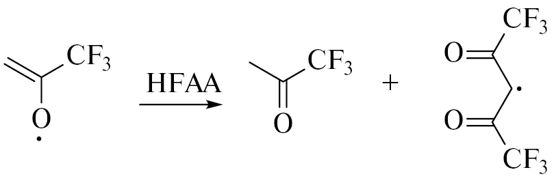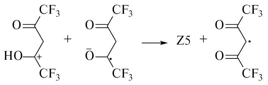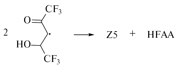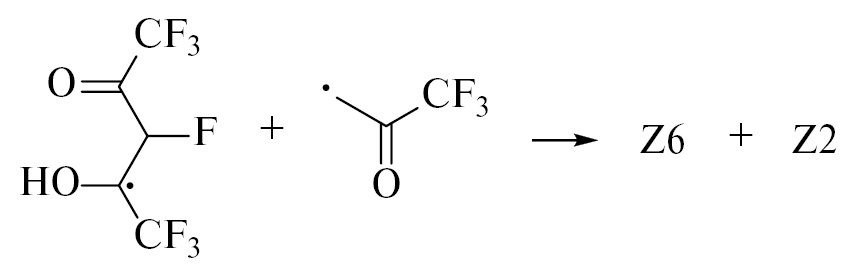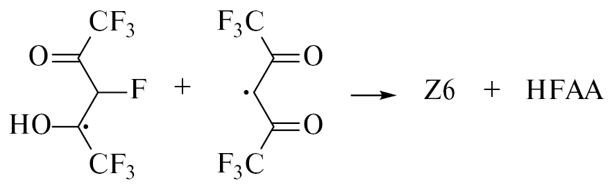 Наличие группы CF3 повышает реакционную способность изомеров трифторацетонильного радикала в отщеплении атома Н от соседней молекулы ГФАА с образованием трифторацетона (продукт Z2) и радикала, неспаренный электрон которого, как и в случае АА, локализуется преимущественно у атома С(3):