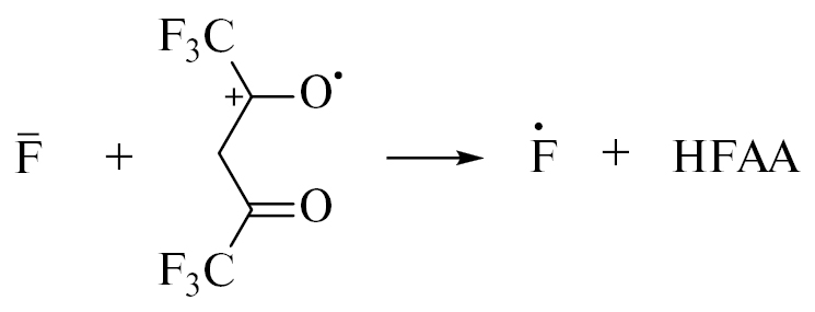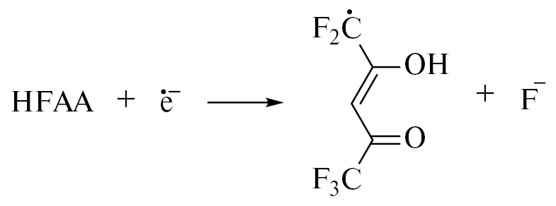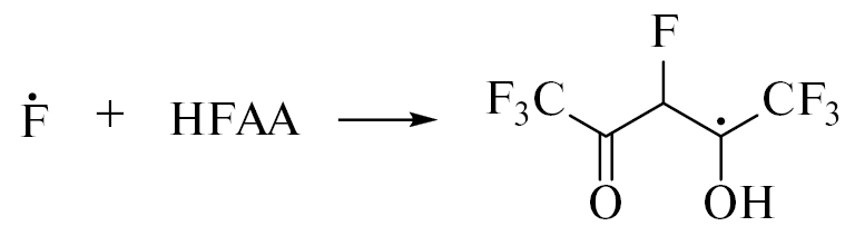 НF может появляться при протонировании F- (например, в присутствии Z3) или в результате прямого элиминирования HF из анион-радикала [18, 20]. Однако гомолитический разрыв одиночной связи в жидкости более вероятен, по сравнению со сложной перегруппировкой, дающей молекулу HF. Радиолиз частично фторированных алифатических соединений, как правило, сопровождается образованием НF по радикальному механизму. Например, при облучении формаля-2 (бис(2,2,3,3,4,4,5,5-октафторпентокси)-метана, C11F16H8O2) выход HF достигает 0.5 мкмоль/Дж [19, 21]. Но формаль-2 состоит из насыщенных связей, а электронная доля F (0.615) и H (0.034) в нем выше, чем в ГФАА (около 0.529 и 0.020 соответственно). Число атомов Н в ГФАА в 3 раза меньше, чем атомов F, и они располагаются в пределах системы сопряжения, т.е. рядом с двойными связями. Таким образом, в формале-2 легкие радикалы преимущественно отщепляют Н, а в ГФАА доминирует их присоединение. НF весьма реакционноспособная кислота, способная присоединяться по двойным связям: