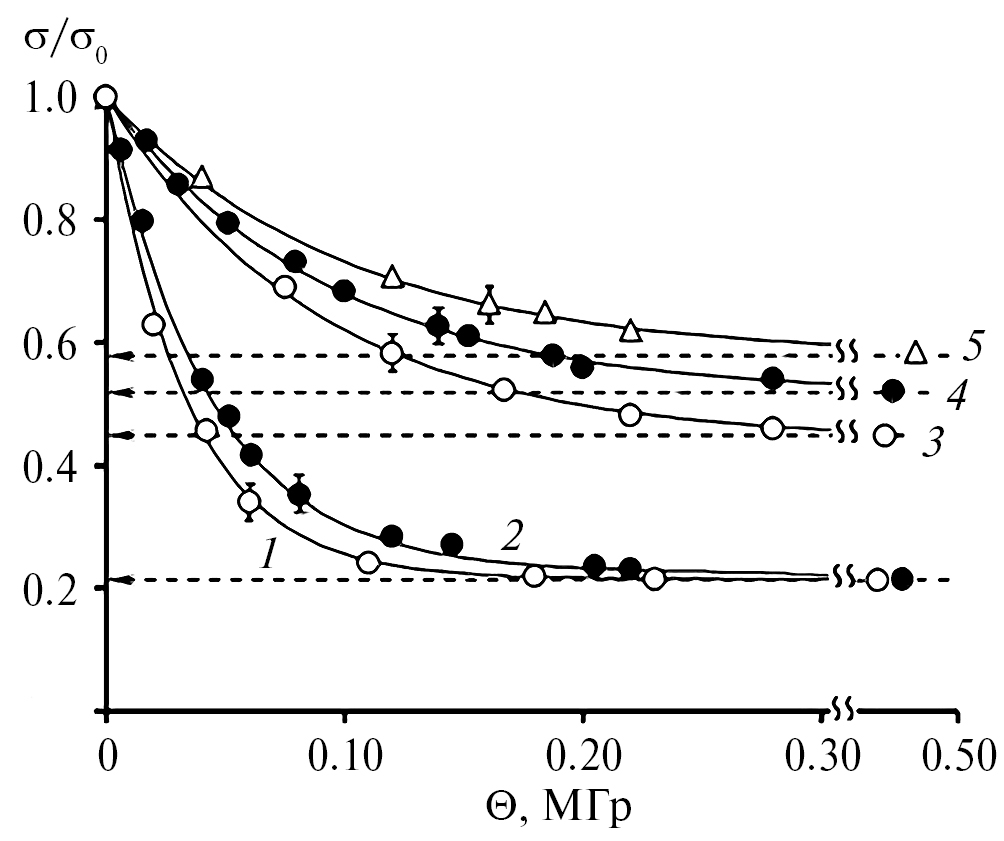- Если наряду с деструкцией макромолекул в какой-то мере протекает также и их сшивание [3], то образование сшивок будет приводить к возникновению некоторого (иногда существенного), количества новых, т.н. вторичных проходных цепей. Образование таких вторичных проходных цепей может отчасти компенсировать радиационно-инициированную деструкцию первичных проходных цепей, т.е. изначально имевшихся в ориентированном образце. В результате этой компенсации снижение прочности будет замедляться, а величина s∞ будет возрастать, как это показано на рис. 1 (кривые 3−5) для волокон ПА-6.