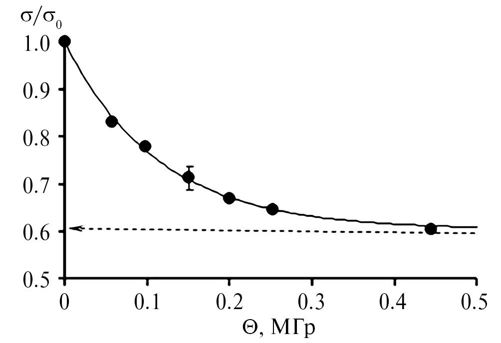 Радиационный выход снижения прочности микропластика составил Gσ = 8,8 МГр-1, что несколько меньше радиационного выхода снижения прочности “чистых” волокон Gσ ≈ 11 МГр-1при той же мощности дозы Р = 2 Гр/с (табл. 1). Эти различия связываются с затрудненным доступом кислорода к волокну через слой связующего, и в этом случае радиационное старение волокна в микропластике происходит при пониженной концентрации кислорода. Вследствие этого вклад окислительной деструкции в изменение прочности будет уменьшаться, а вклад сшивания макромолекул увеличиваться. Это и приводит к увеличению σ∞ /s0 облученного композита (рис. 3) по сравнению со значением σ∞ /s0 исходных армирующих волокон ПА-6 (рис. 1), облученных на воздухе при той же мощности дозы.