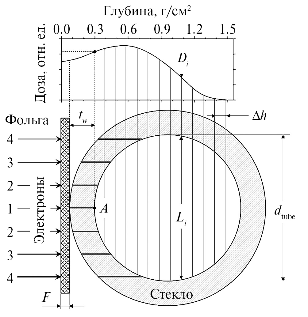 Рассматривалось облучение жидкости с плотностью 1.0 г/см3 (вода) горизонтальным электронным пучком в пробирке или цилиндрической трубке из стекла Пирекс (плотность 2.23 г/см3). Пучок электронов (рис. 1) последовательно поглощается в фольге (толщиной F) пучкового окна, в воздушном зазоре и в стенке трубки (толщиной tw), а затем проникает в жидкость (толщина dtube). Пленочный дозиметр располагается в точке А на внутренней стенке трубки. Его показания далее обозначаются как Dcont. За трубкой следует воздушное пространство (не дающее обратного рассеяния электронов, проникающих за пределы трубки). Цилиндрическая форма затрудняет прямой расчет средней дозы в жидкости, помещенной в трубку, поскольку ширина и толщина поглощающего водяного слоя изменяются вдоль сечения трубки.